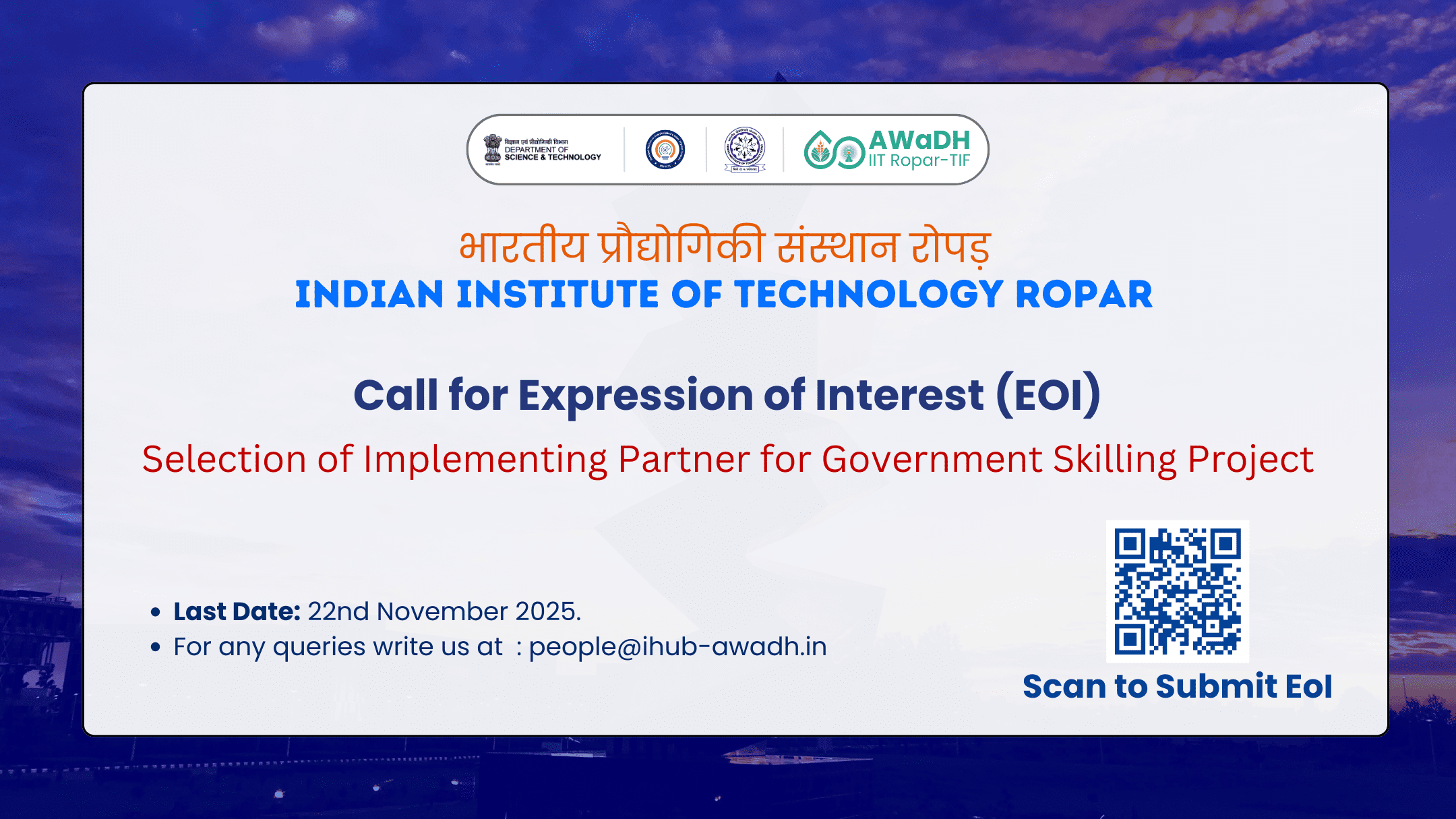 The IIT Ropar Technology and Innovation Foundation (AWaDH) invites Expressions of Interest (EOI) from qualified and experienced organizations to serve as Infrastructure, Mobilizing, Outreach, andView More